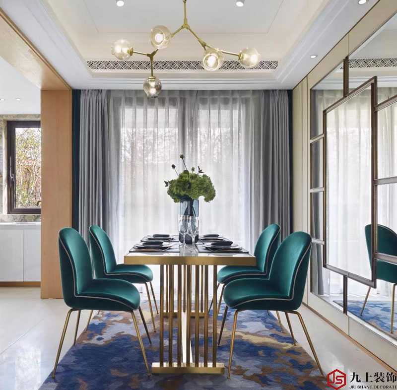 餐廳墻面是米色皮革嵌金屬條處理手法,畫框式的鏡子組合使餐廳空間變得開闊明亮。白色石材亮黃色金屬結(jié)合的餐桌,搭配孔雀綠的餐椅,精致的球形泡泡吊燈,現(xiàn)代感十足。