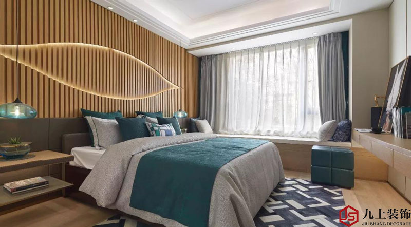 主臥的背景墻是“瞇起來的眼”造型的淺色木格柵,下面是黑色皮革的床屏,整體造型獨(dú)特而具有藝術(shù)美感。軟裝上呼應(yīng)整體,孔雀綠色的現(xiàn)代吊燈,深綠色的抱枕點綴了空間。整體色調(diào)冷靜,冷暖對比和諧。