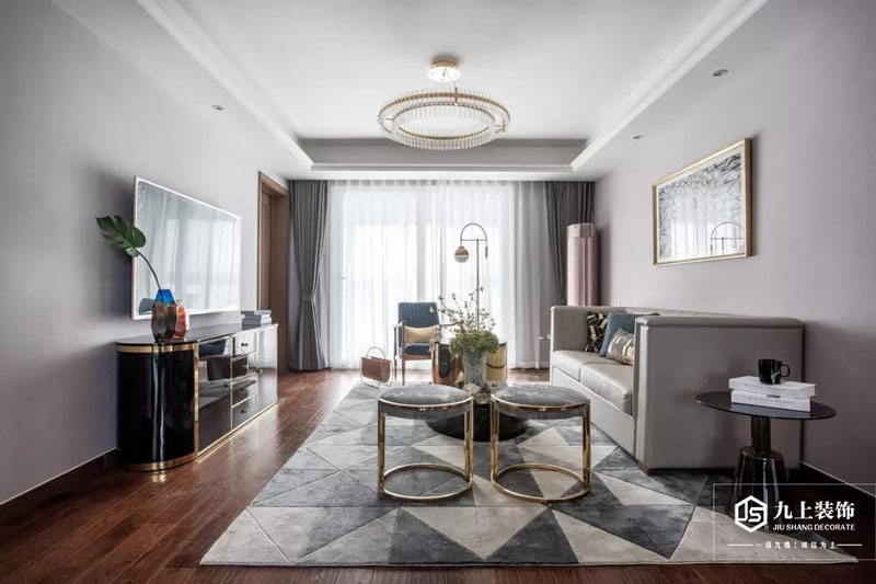 米白色沙發(fā),高低臺面的茶幾,灰白拼的三角幾何地毯上呈現(xiàn)的是靜謐優(yōu)雅的畫面。