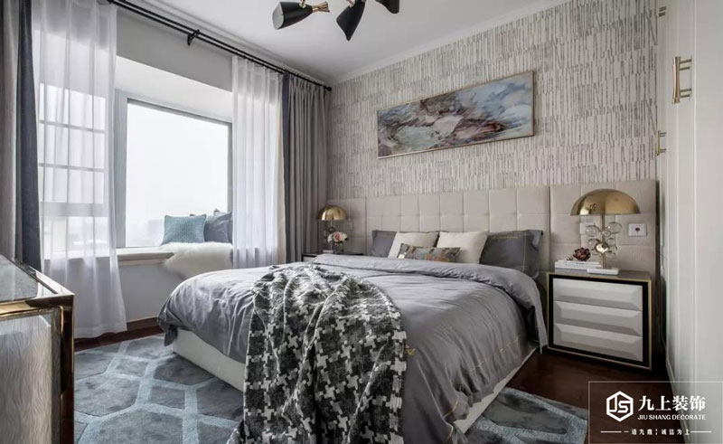 床頭靠背延伸到床頭柜兩邊,強調出對稱布局的端莊感。而床頭墻是灰白豎紋的壁紙,結合同樣是灰白調的床鋪,帶來溫婉大方的視覺感受。