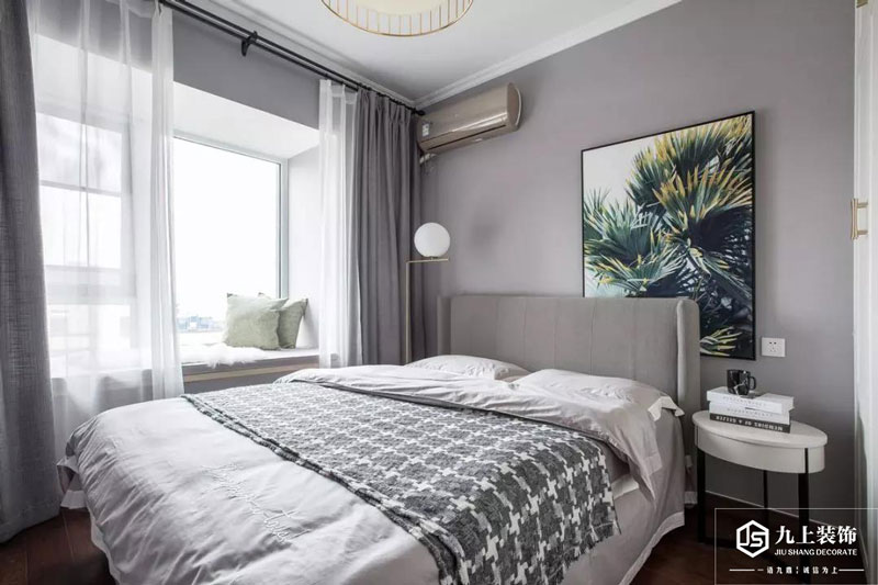 灰色床頭墻,裝飾畫是不在中心的布置,避免了與空調在視覺上產(chǎn)生擁擠壓抑感。