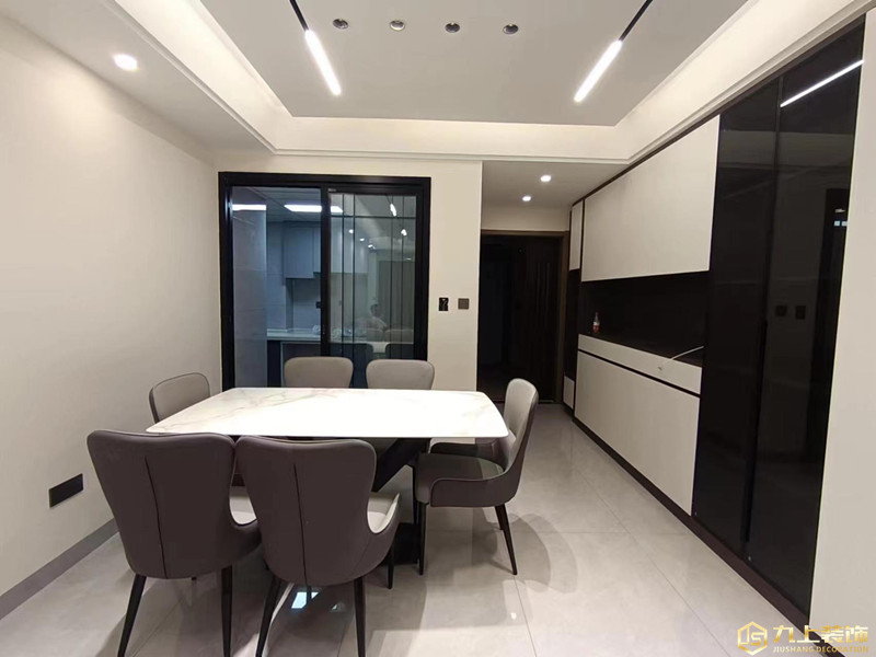 大面積的灰色鋪墊,巧妙地以淺咖、白色進(jìn)行糅合,使整個(gè)空間給人以開放、寬容的非凡氣度。餐廳不失為整個(gè)空間的亮點(diǎn),極具線條美的金屬吊燈營造出高雅輕靈的氣質(zhì)氛圍。白與黑的搭配,帶來極為舒適的視覺變化,互相融合交織共奏。簡約的餐邊柜設(shè)計(jì),于低調(diào)中顯露不俗的品質(zhì)美感。