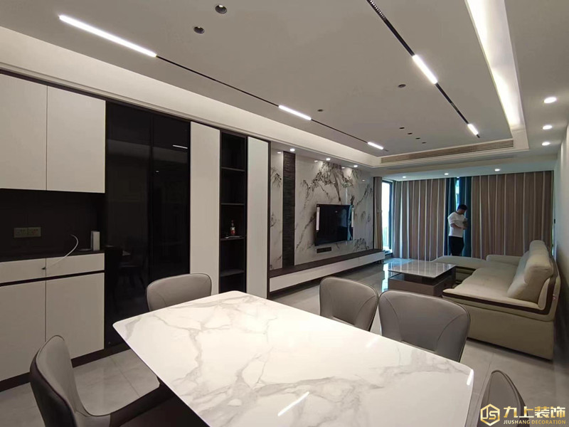 進(jìn)入客廳,宛如感受了時(shí)尚與奢華風(fēng)格在此的邂逅。大面積的灰白色調(diào),形成鮮明強(qiáng)烈的對(duì)比。大理石與暖色燈帶的使用為客廳空間渲染上一層奢華質(zhì)感格調(diào)。木質(zhì)茶幾、明亮的壁爐、金屬線條點(diǎn)綴,碰撞出極具韻律感的視覺沖擊,無不散發(fā)著奢華、雅致的空間氣質(zhì)。