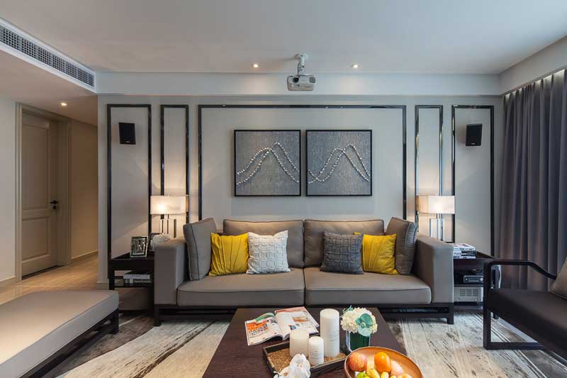 這個(gè)空間以灰色調(diào)為主,設(shè)計(jì)師以不同程度的灰色使空間更有層次感,鮮黃色的抱枕讓空間更跳躍。