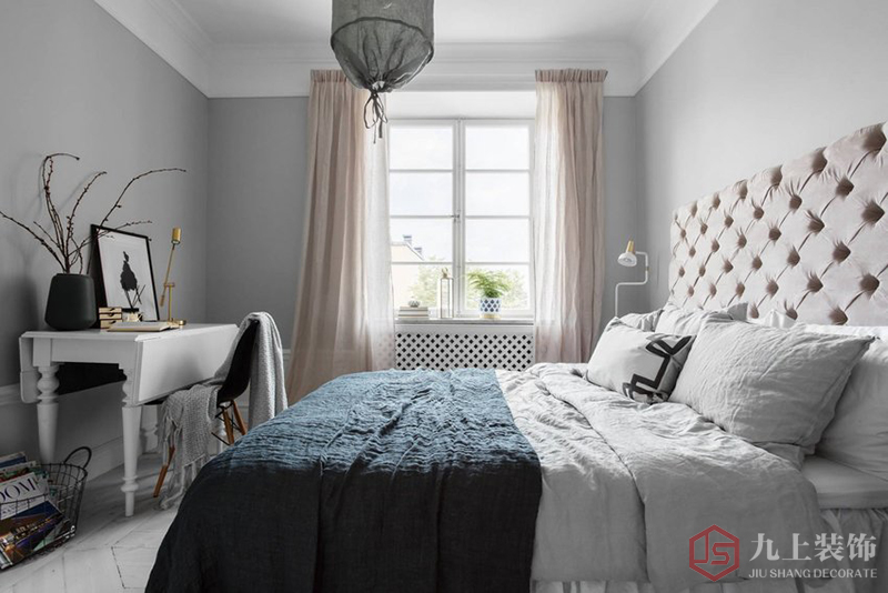 與客廳一樣。設(shè)計(jì)師選用裸粉色來妝點(diǎn)臥室,讓睡眠空間多了一絲溫暖和柔和。
