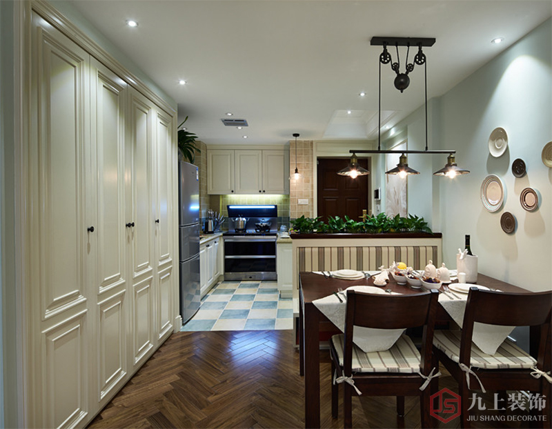 餐廳邊上儲物柜增加儲物功能,墻上用盤子裝飾,經(jīng)濟美觀。