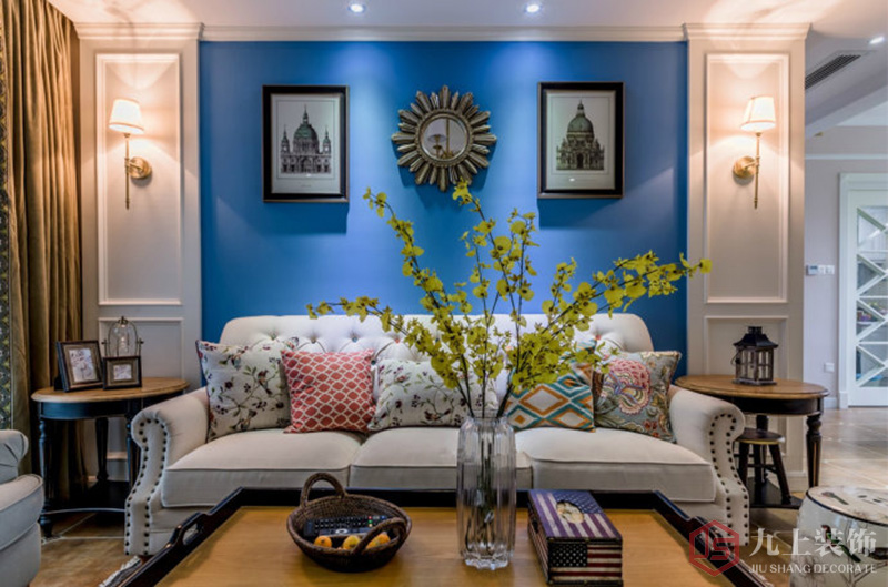 藍色的沙發(fā)背景墻面,有著地中海的清新與自然,顯眼又時尚年輕,相框畫的裝飾和點綴讓美式風格得到彰顯,綠植與盆栽,只為呈現(xiàn)美式中的一抹清爽悠閑。