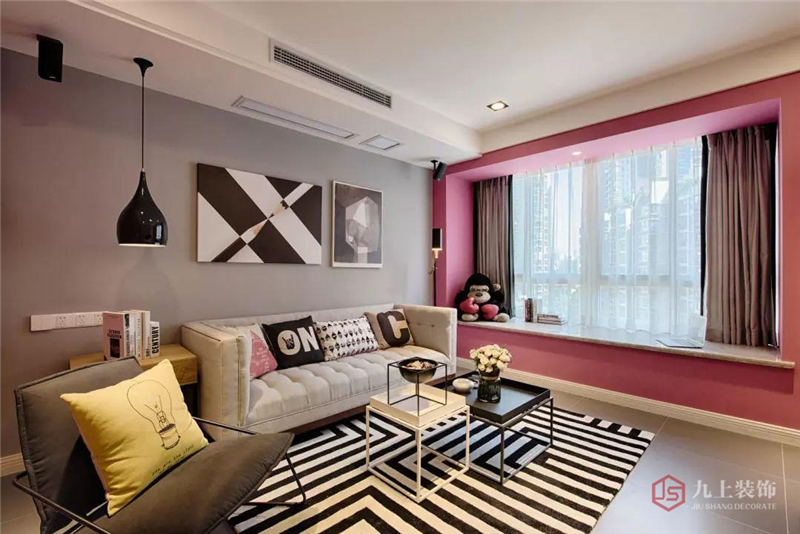 客廳空間黑白元素很多,加以黑白幾何形狀掛畫裝飾,粉色的可愛遇到灰色的冷酷,黑白的冷冰遇到木色的溫暖,帶來意想不到的驚喜。