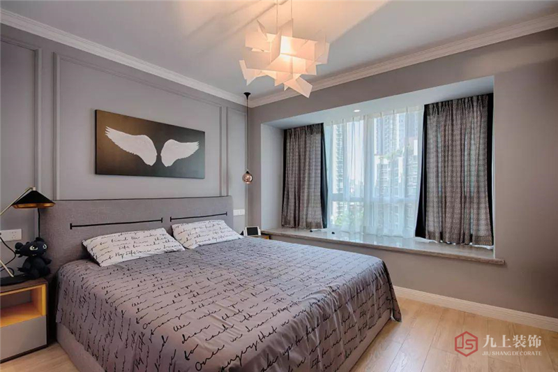 臥室走干練簡潔風,燈具造型十分時尚,充滿了藝術意境。天使翅膀黑白掛畫在灰色背景墻里引人注目。