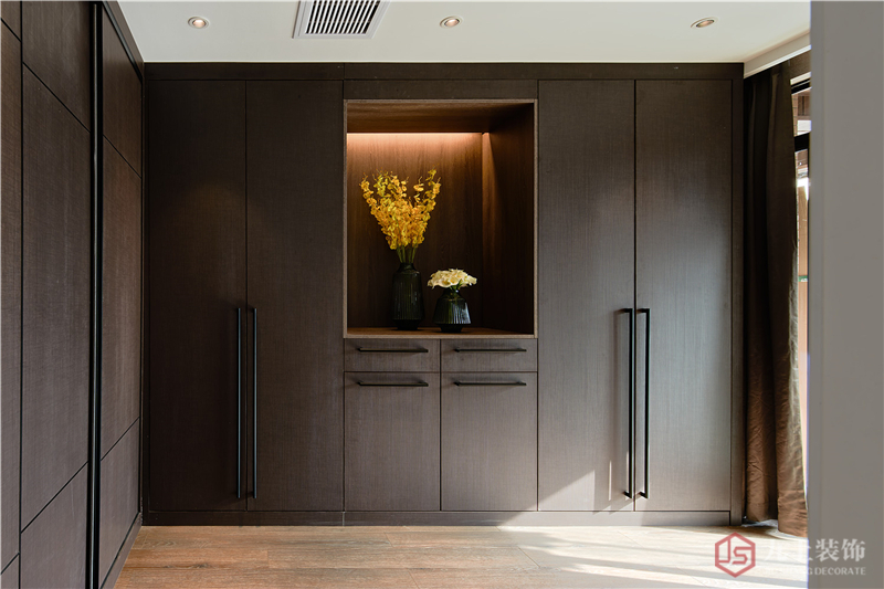 衣柜選用深灰色,莊重沉穩(wěn),還耐臟,柜子中設(shè)計(jì)了一個(gè)沒有柜門的方形大格子,里面擺上插花,讓衣柜既莊重又典雅。