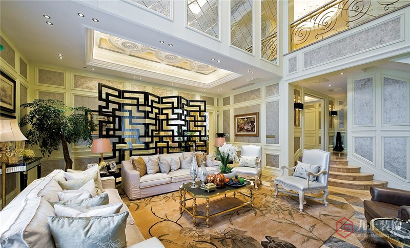 客廳鏤空隔斷看起來十分的復古,地毯的色彩和臺階的顏色也很協(xié)調(diào),地面的菱形瓷磚也很個性。