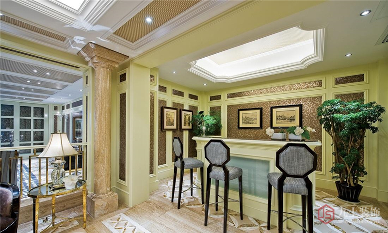 墻面局部使用金色墻紙,看起來富麗堂皇,玉石般的柱子讓氣勢更恢宏。