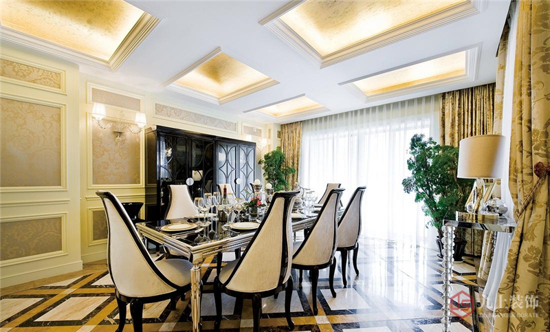 金色窗簾與金色墻紙相互呼應(yīng),餐桌餐椅的色彩搭配與地磚的黑色線條十分和諧。