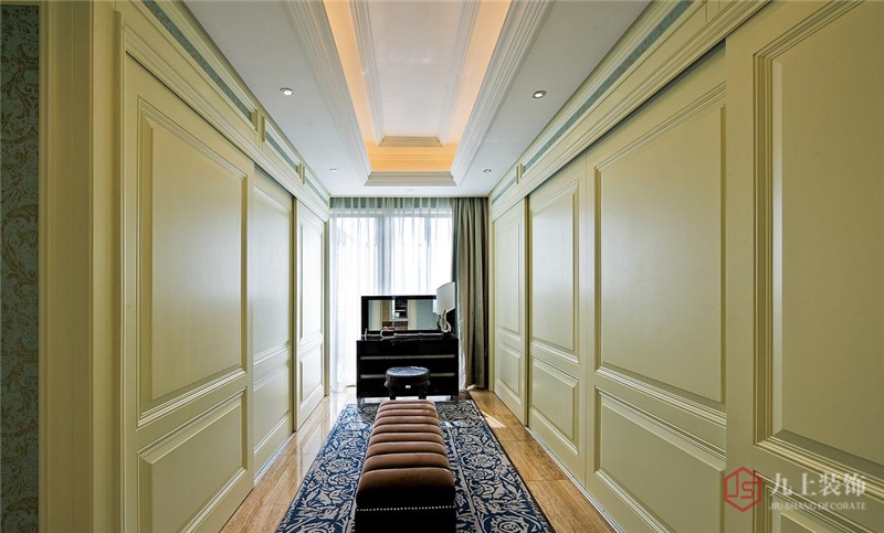 衣帽間里兩邊都設(shè)置了很寬的衣柜,窗邊的梳妝臺做了幾個抽屜,方便收納。