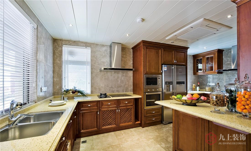 廚房以實木柜子為主,看起來很有質(zhì)感和品味。