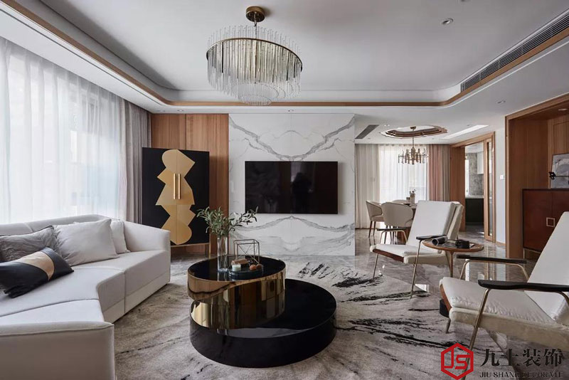 造型簡潔的水晶吊燈,淺色系弧形沙發(fā),黃銅烤漆茶幾以及各種時尚元素的搭配組合,讓家變得十分迷人,生活也仿佛多了一份舒心和愜意