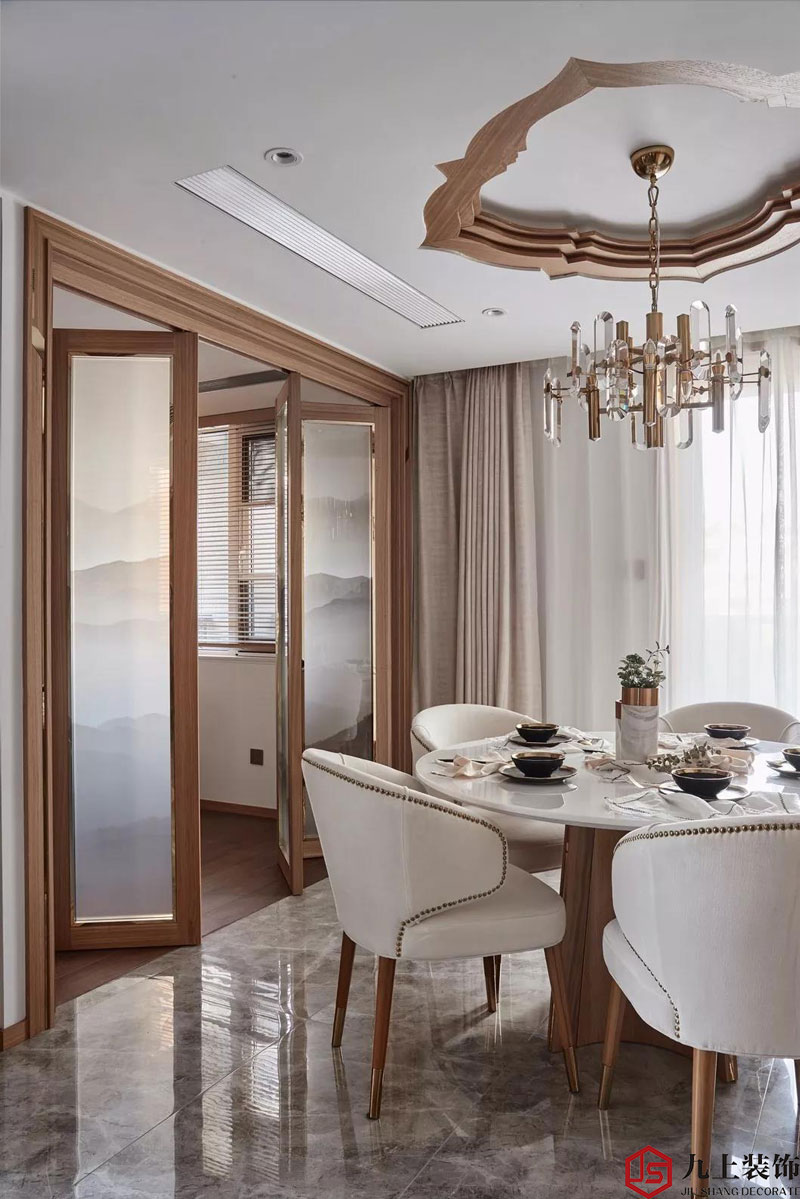餐廳與書房之間的這扇開合自由的夾絹折疊門,是這個空間的點睛之筆。它既實現了空間區(qū)隔的功能,又起到了美化裝飾的作用。一幅淡淡的水墨畫層次明晰,疏遠曠達,形成極強的藝術感染力。