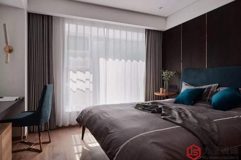 深色木質墻面與同色系窗簾、床品的巧妙搭配,給臥室注入了一股寧靜、沉穩(wěn)卻不失高雅的格調。但為了柔化這種沉悶氛圍,金屬線條與幽藍色的適當點綴,于不經意間點亮了空間表情,充分彰顯出主人的時尚品位。