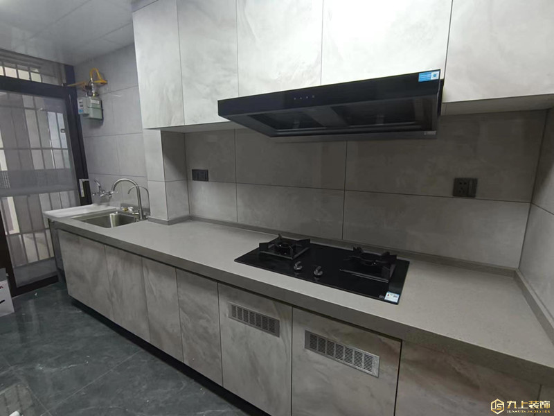 廚房采用了灰白色櫥柜門板,搭配黑色電器和灰色墻面地磚,整個(gè)廚房設(shè)計(jì)簡(jiǎn)潔大方,白色櫥柜門板讓整個(gè)空間更顯寬敞明亮,黑色電器則增添了一份低調(diào)奢華感,灰色墻面磚的運(yùn)用則為整體色調(diào)增添了一份沉穩(wěn)與穩(wěn)重,這樣的設(shè)計(jì)不僅美觀大方,還極具實(shí)用性,讓人在烹飪的同時(shí)也能感受到時(shí)尚與舒適。