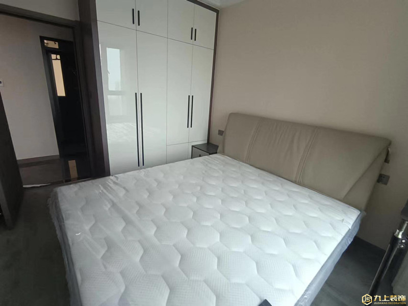 在主臥空間中,布置了一張實(shí)木床,床尾處的衣柜設(shè)計(jì)簡(jiǎn)潔大方與墻面融合,提供一個(gè)一個(gè)充滿溫馨與舒適的家居睡眠環(huán)境。