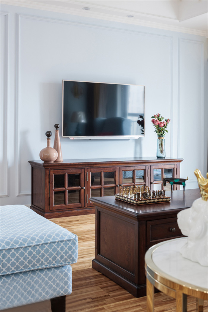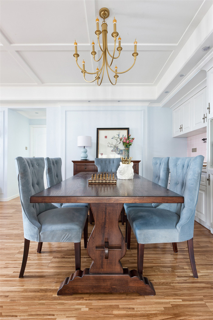 客餐廳采用魚骨拼花地板,選擇金屬材質(zhì)邊框的家具及淺木色茶幾,搭配上簡單幾何圖形地毯,使整個空間層次分明。在搭配上銅藝吊燈及頂面田字格造型吊頂,使原本單調(diào)的空間,豐富起來。墻面淺藍(lán)色乳膠漆的選擇,更加體現(xiàn)出女業(yè)主少女情懷。背景墻石膏線條簡約的拼接,文化石的選擇,都是為了體現(xiàn)出人文自然返璞歸正的感覺。