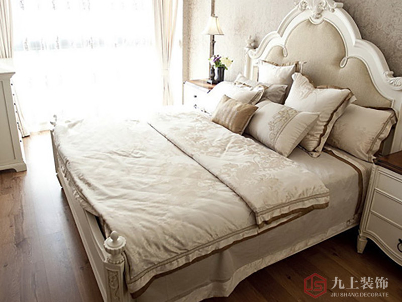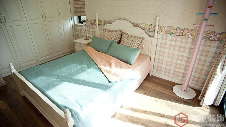 次臥設(shè)計(jì)得非常的小清新,床跟床上用品都非常的搭配,還有大衣柜在床邊。