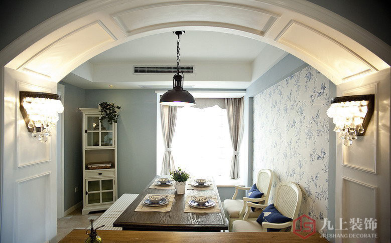 餐廳跟客廳一樣,也采用了飄窗設(shè)計(jì),圓拱門的造型,再配上歐式的餐椅。