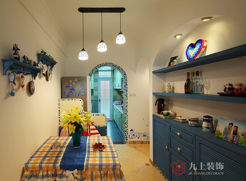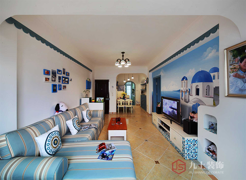 客廳主色調(diào)就是海天藍(lán)色,仿佛置身于陽(yáng)光沙灘,馬賽克電視柜,充滿浪漫異域風(fēng)情。
