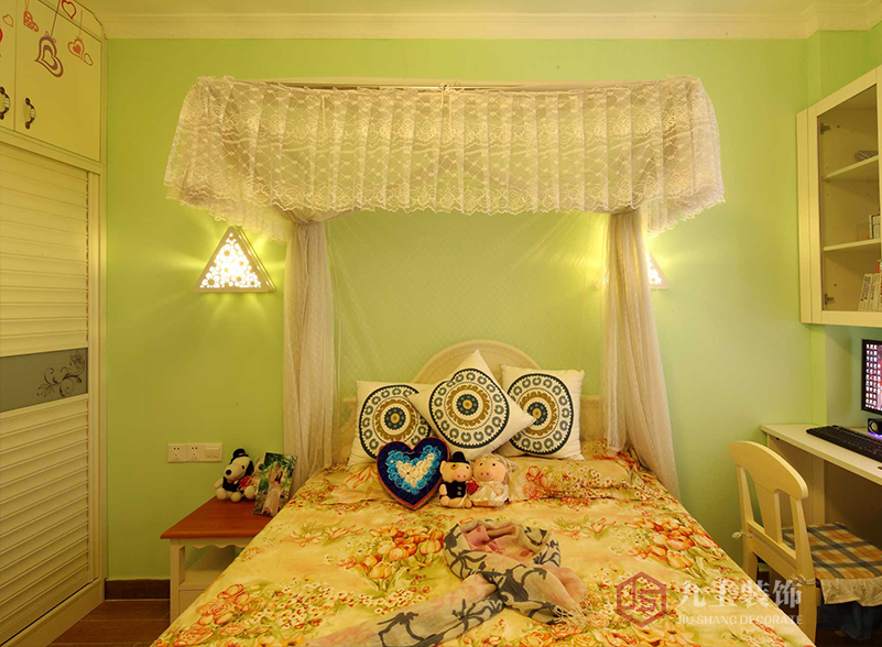 高腳床,暖色系床單 ,蕾絲,清新綠,如此的時(shí)尚浪漫又自由悠閑。