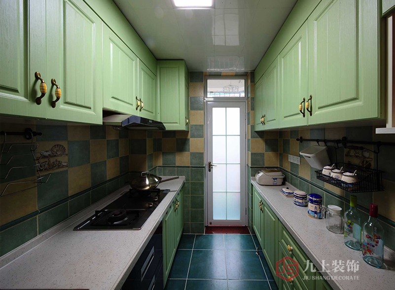 淺綠色木制櫥柜,格子墻磚,清新的歐洲小廚房。