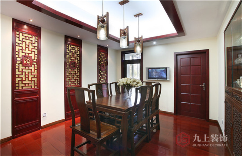 餐廳青檀木的桌椅,紅棕色的實(shí)木地板,存托主人家的氣質(zhì)。