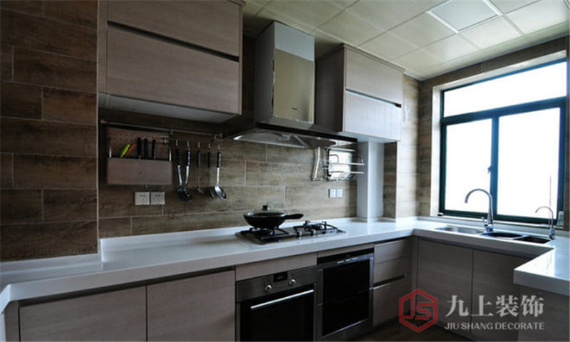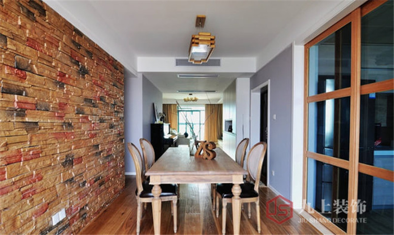 餐廳采用實(shí)木地板,結(jié)合墻磚很有畫面感。