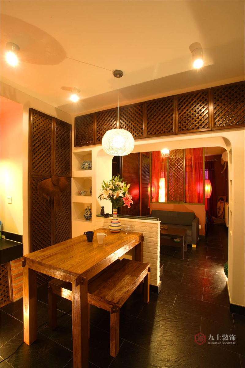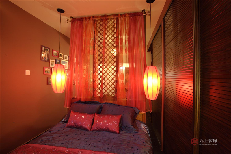 臥室家具及裝飾皆采用東南亞風(fēng)濃烈的色彩,搭配夢幻曖昧的燈光,充滿異域情調(diào)。