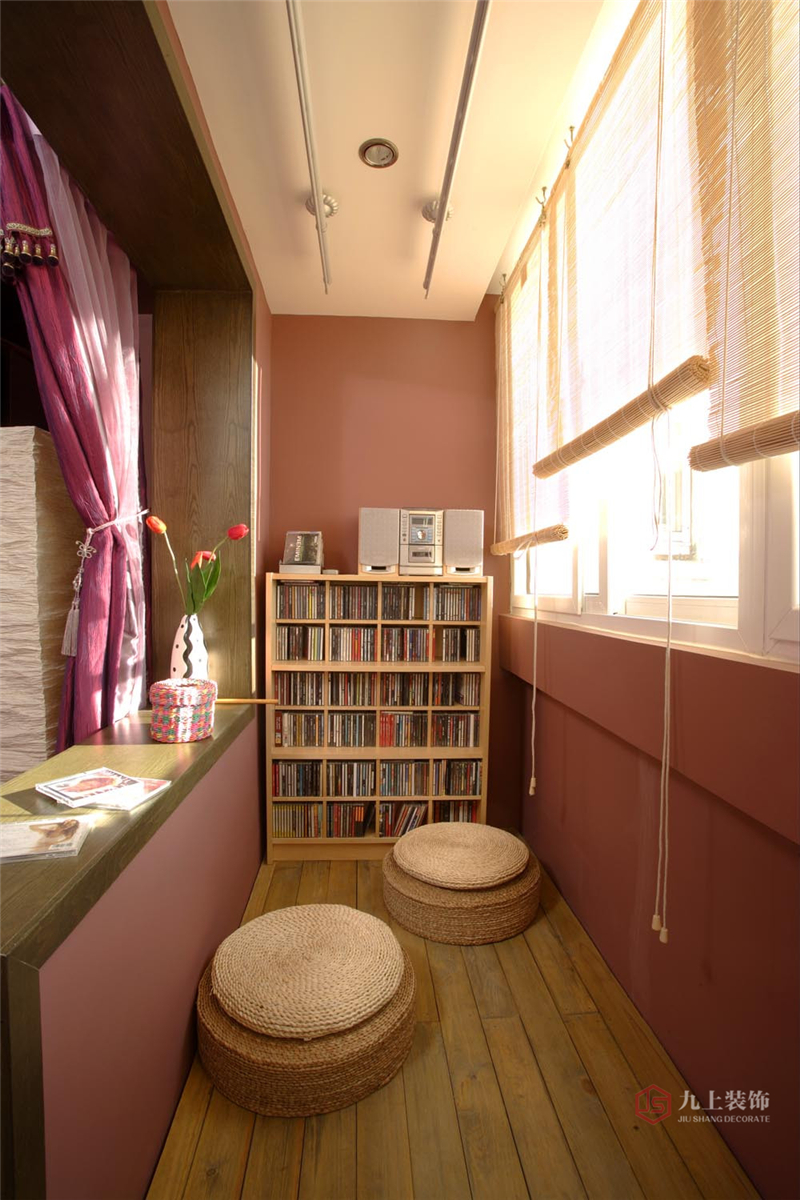 陽臺改造成了私密性極高的書房,暖暖的陽光,以及淺色的書架和地板,尤其手工榻榻米坐墊,使環(huán)境舒適悠閑。