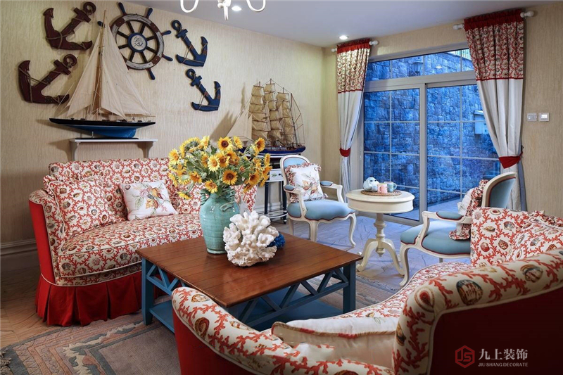 淺黃色的墻上掛著很多裝飾品,舵盤,船錨,帆船,極具海洋特色。