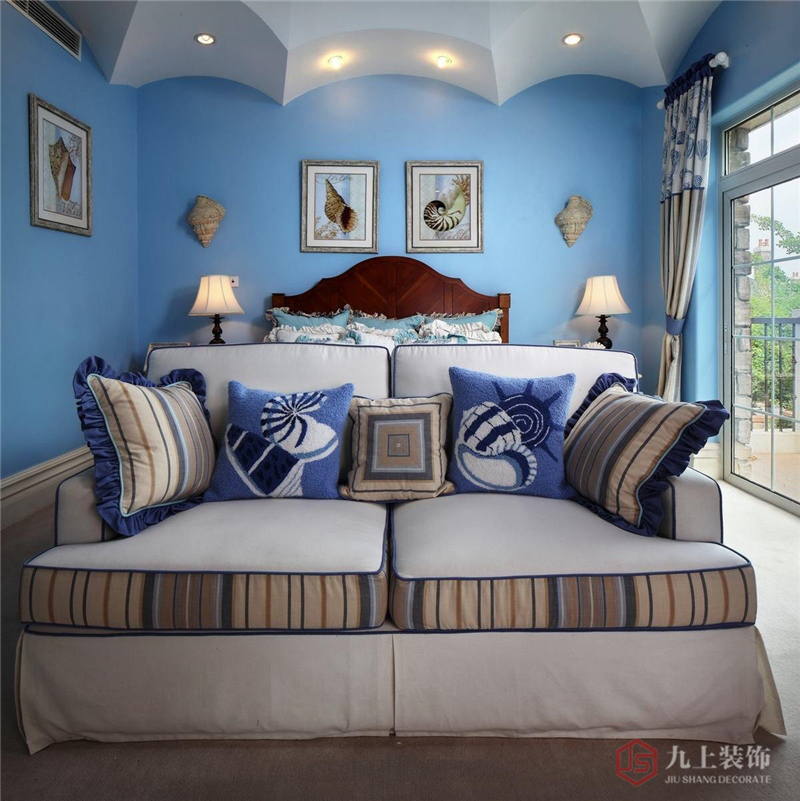 主臥吊頂別致個(gè)性,形似扇貝。淺藍(lán)色墻面掛著海螺工藝品和不同品種的海螺畫,讓人一看到就想到大海。床尾沙發(fā)方便看電視。