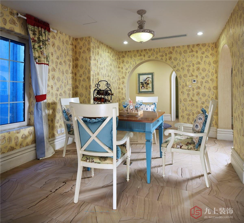 餐廳地磚的顏色和花紋好似經(jīng)過(guò)風(fēng)吹日曬的巖石,給人以親近大自然的感覺(jué)。墻紙的花色與窗簾上端的花紋很搭配。