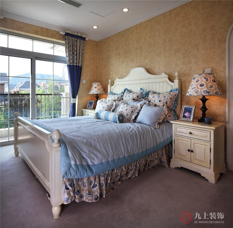 次臥臺(tái)燈紋飾與窗簾、相框、床品都很搭配。