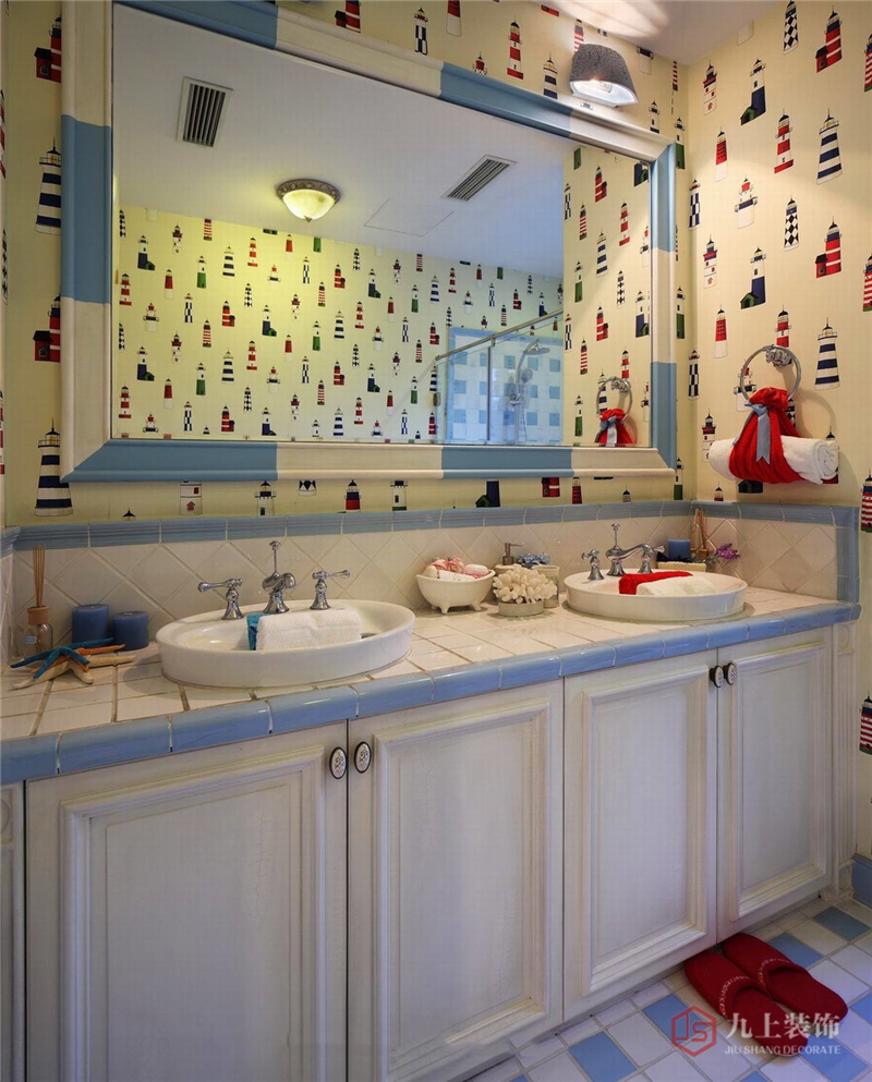洗手臺(tái)上面的淺黃色墻紙融入了各種燈塔元素,象征光明與希望。瓷磚和鏡子邊緣都以淺藍(lán)和白色為主,協(xié)調(diào)統(tǒng)一。