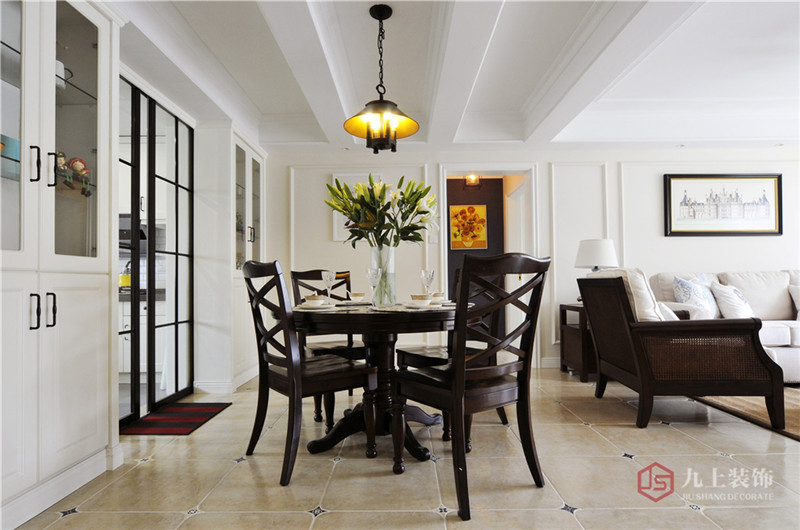 餐桌置于客廳與廚房之間,讓餐廳于無形中綻放開來,讓深棕色的十字餐椅與廚房黑色格子移門有了形態(tài)上的互動(dòng),舒適討巧