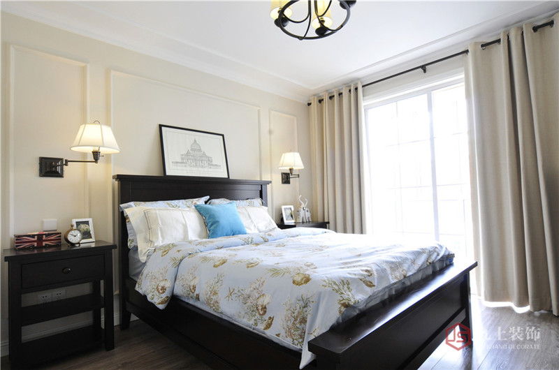 主臥依舊延續(xù)了客餐廳鵝黃與深棕的配搭,立體有型的線條無處不在,饒有情趣的壁掛式臺(tái)燈靜默成畫,纏纏綿綿