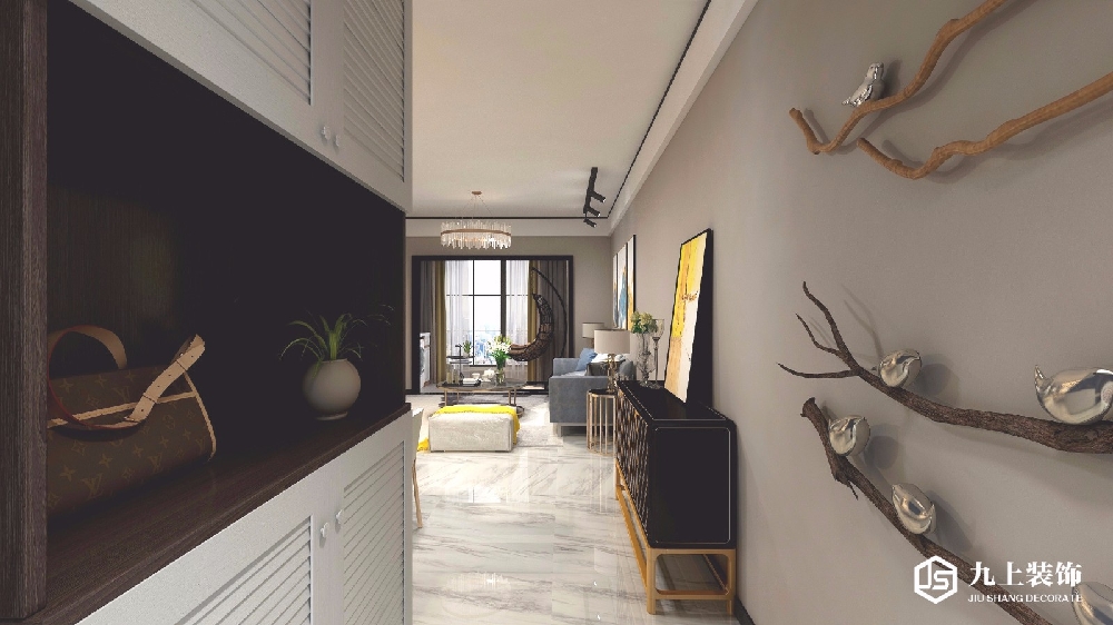 玄關左邊是白色百葉窗式的鞋柜。中間留有空間放置小物件。深色與白色柜門形成鮮明對比。視覺沖擊。鞋柜對面很有藝術性的裝飾品,入門就是景觀。