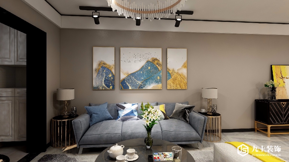 客廳依然是風格明顯。沙發(fā)以冷色調的基礎,金屬質感的臺燈,配上明黃色的壁畫。極具視覺沖擊感。但是撞色都是適可而止,不會顯得過于復雜。