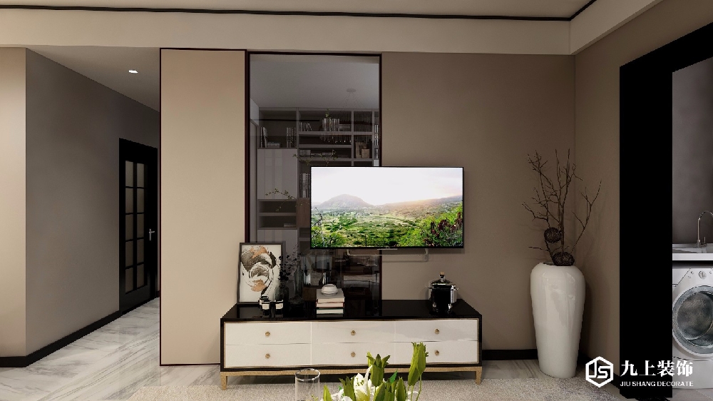 電視墻的設計又歸于簡約。點睛之筆的是部分墻體為玻璃,可以看見墻后的書房的一部分,讓人對墻后面的風景遐想不已。