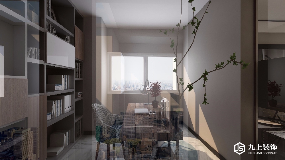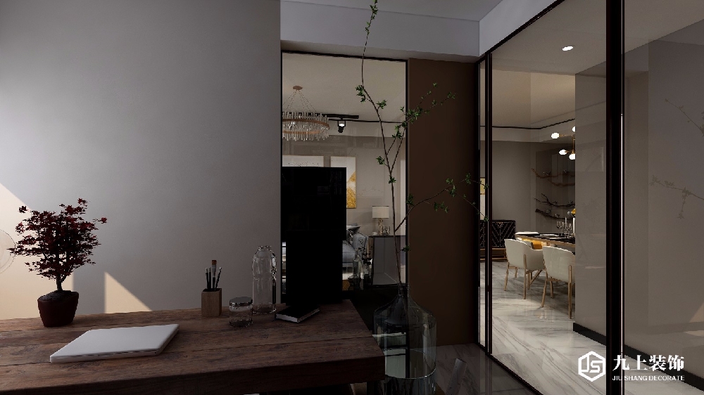 書房可以看見客廳但是又有明顯的分區(qū)。景與景之間相輔相成,互不影響。