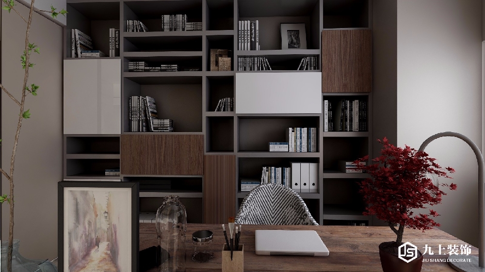 書房選擇比較有意境的古典風格,顏色偏深,搭配富有意境的盆栽。玻璃墻體,有讓書房不會顯得過于壓抑。