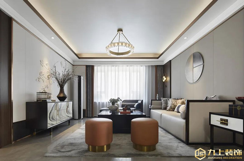 客廳空間整體現(xiàn)代時(shí)尚+東方意境的設(shè)計(jì)氛圍,整體空間布置優(yōu)雅中帶著復(fù)古范的氣息,在門套線、踢腳線與天花四周加入金屬材質(zhì)的裝飾,布置上橙色的圓形鼓凳,也讓空間顯得更加優(yōu)雅華麗而時(shí)尚。