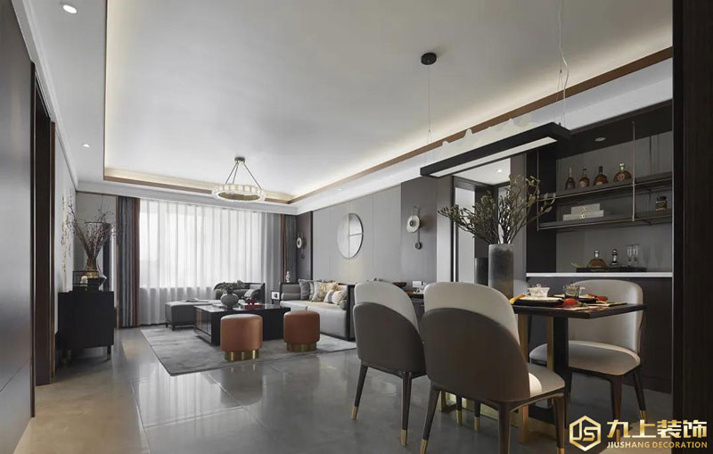 餐廳與客廳空間的天花造型做成一體的造型,地面也是統(tǒng)一的灰色地磚,布置上穩(wěn)重端莊的餐桌椅,灰色皮藝餐椅坐墊靠背,餐桌上再布置上精致禪意的餐具與花瓶,也讓用餐空間顯得格外的優(yōu)雅高級(jí)。