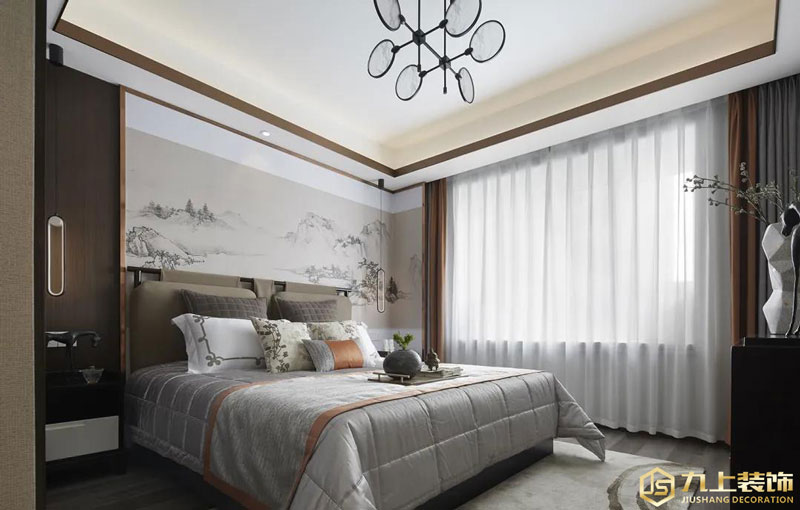 臥室床頭墻是一幅墨意山景畫、左側(cè)還加入木飾面的設(shè)計(jì),布置上木框架的床鋪,素雅華麗的床單、枕頭與窗簾,也讓空間顯得格外的溫情優(yōu)雅而高端。