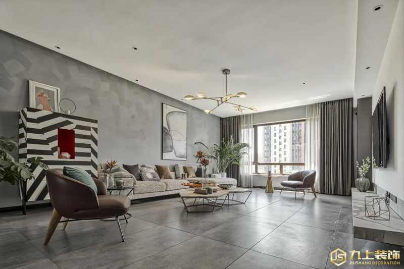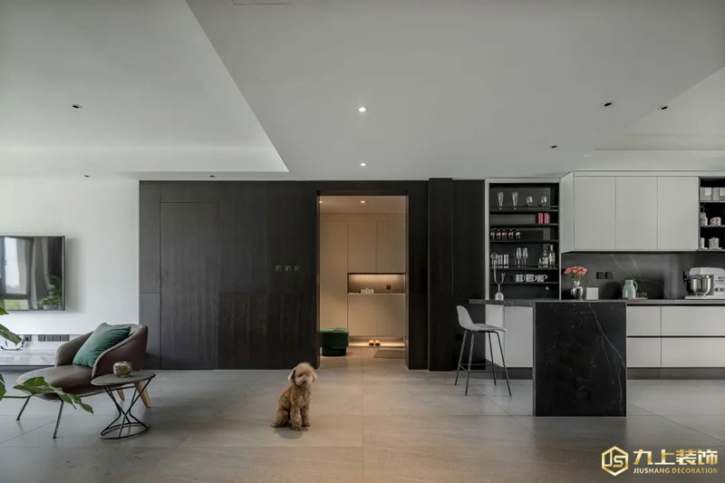 客廳空間通過隱形門及入戶玄關(guān)埡口的弱化,使該弱的地方弱、該強的地方強。視覺不致凌亂,達到整體統(tǒng)一的效果。